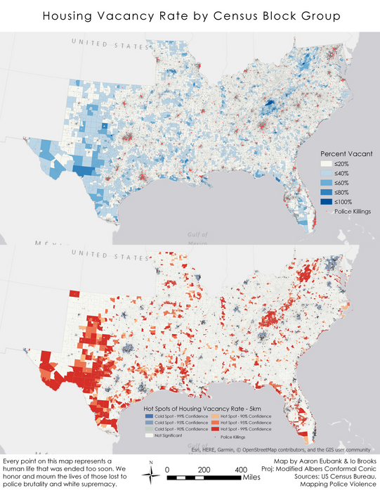 These maps are part of a class project attempting to visualize and determine any relationship between lynchings of African Americans (1890-1900) and police shootings (2013-2018) in the American South. The project involved extensive data preprocessing, spatial statistical analysis and cartography, all using ArcGIS Pro